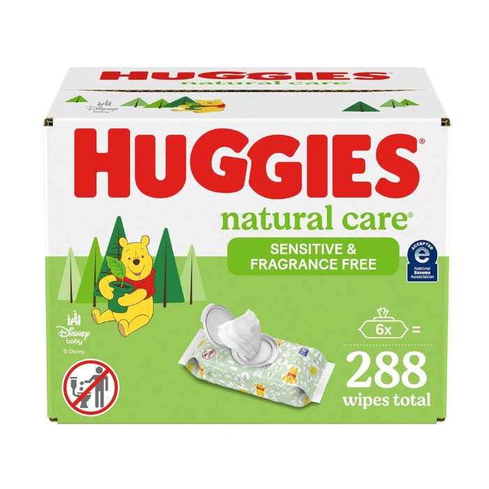 - 6 flip-top packs of 48 Huggies Natural Care Sensitive Baby Wipes, Unscented (288 wipes total).